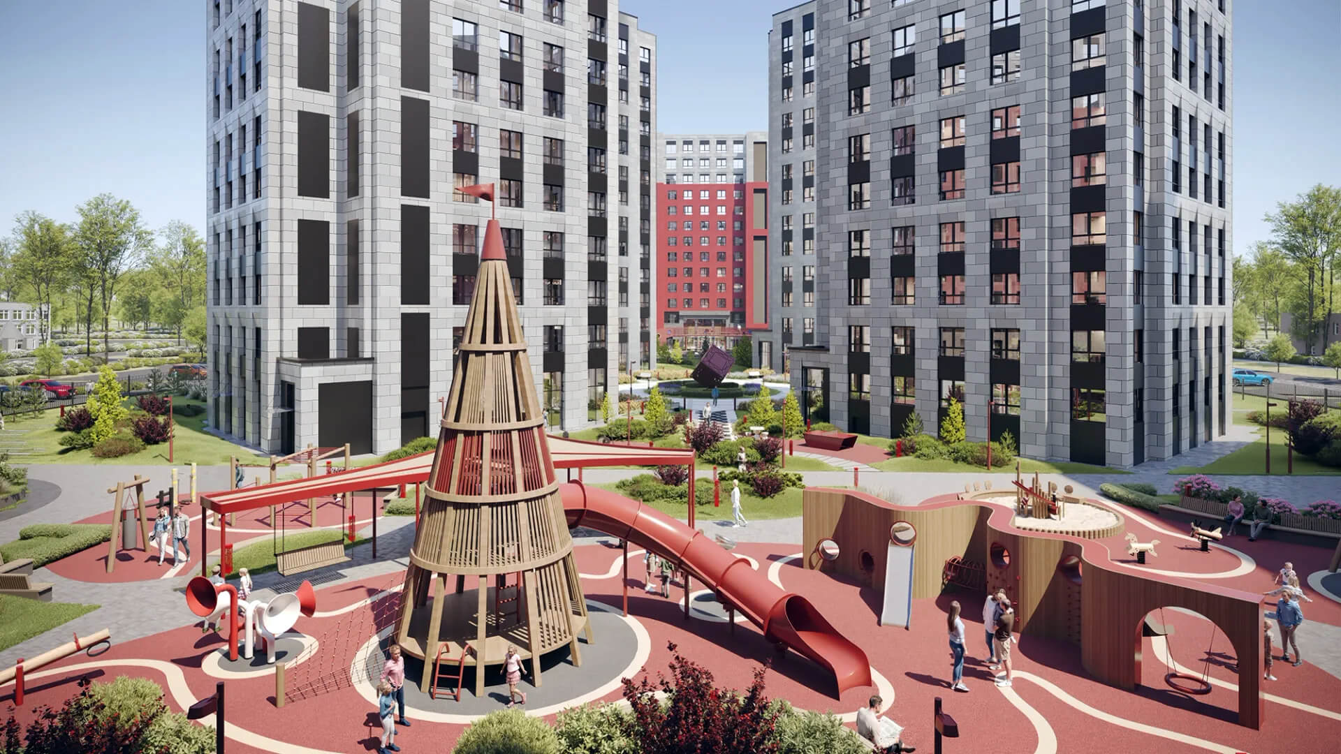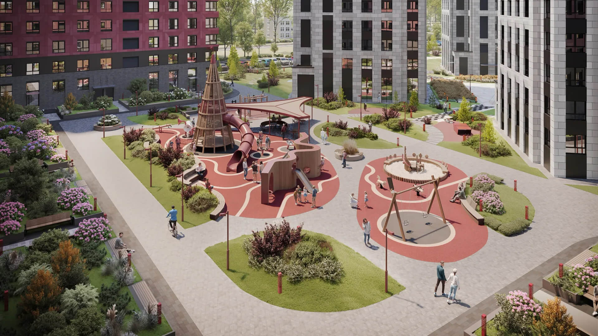 Особое внимание уделено безопасности и удобству: в каждом дворе есть велопаркинги, освещение, продуманное покрытие и специальное игровое оборудование. Закрытое пространство двора защищено от внешнего шума и транспорта, что позволяет создать оазис для жителей. Благоустройство — не декоративный элемент, а полноценное продолжение архитектурной концепции, формирующее идентичность и комфортную городскую среду.