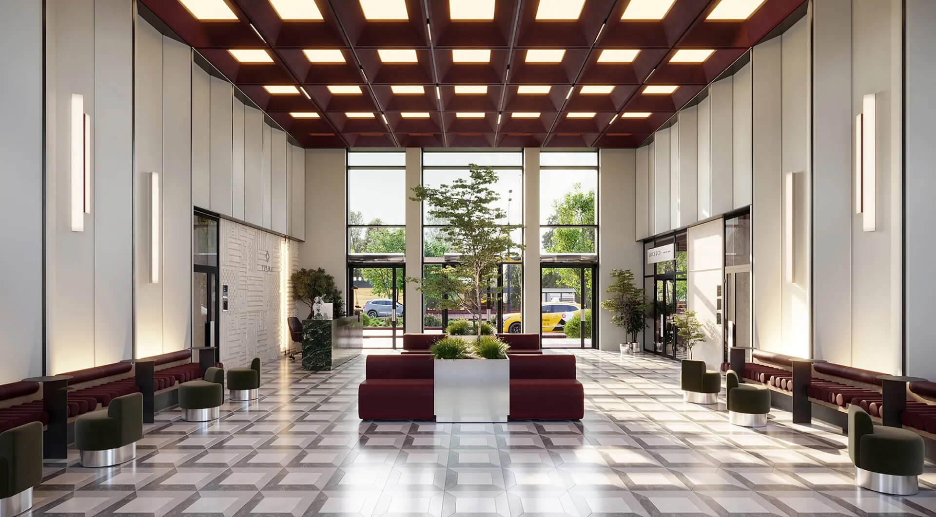 Лобби жилого комплекса «Гранат» — это приглашение в мир дизайна и комфорта с первых шагов. Входные группы продуманы до мелочей: двусветные пространства с витражами и стеклянными дверями создают впечатление лёгкости и света, а визуальная связь с внутренним двором добавляет ощущение открытости. Высокие потолки и продуманная подсветка формируют уютную, представительскую атмосферу, свойственную премиум-подходу.