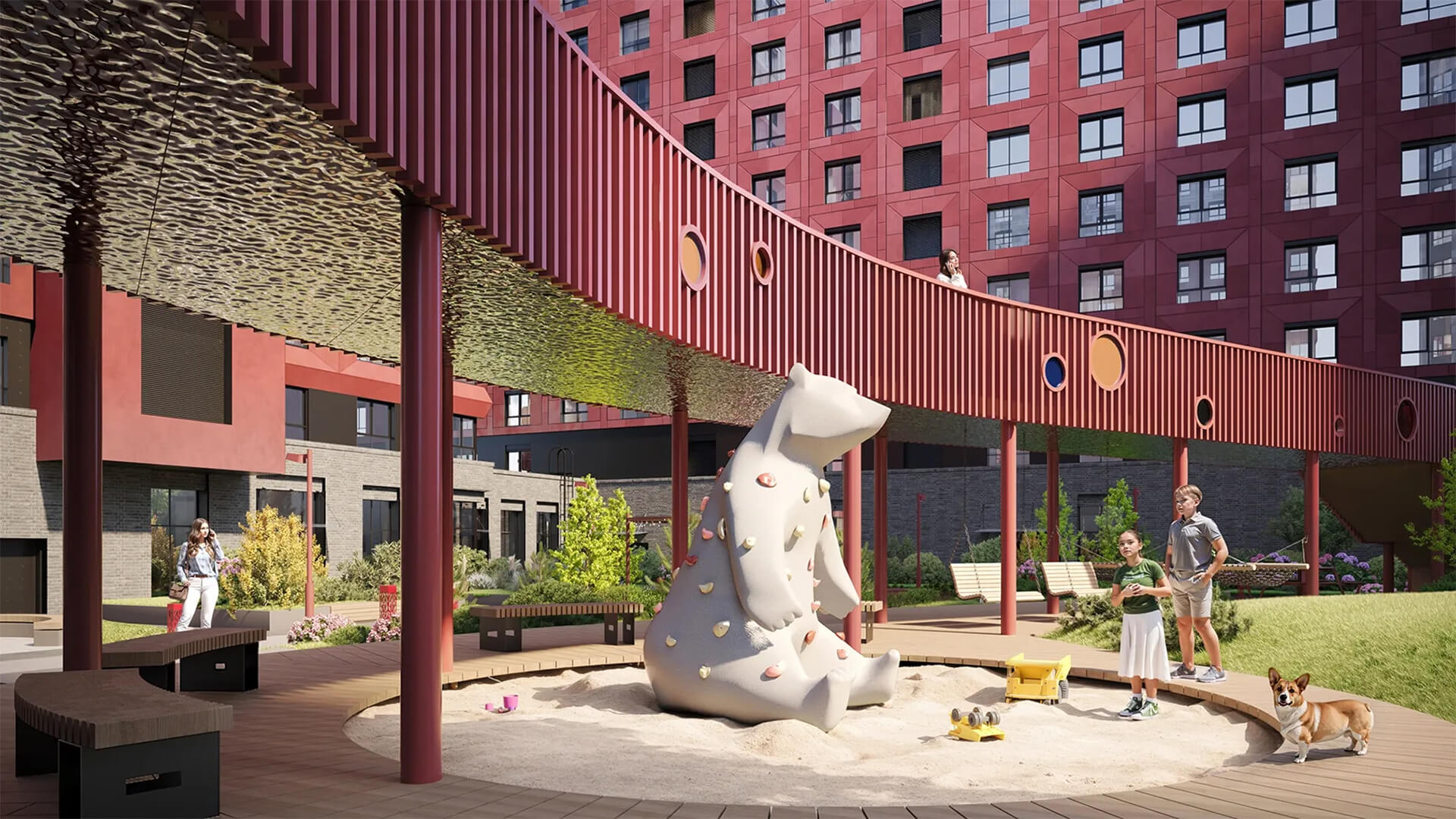 Первый двор у корпуса 6 — ориентирован на активное использование: прогулки, встречи, маленькие мероприятия у амфитеатра. Здесь предусмотрена игровая мостиковая зона, приглашающая детей и родителей к активности. Третий двор — тихая зона отдыха, с навесами, качелями и разделением по возрастным группам, что создаёт приватную среду для семейного уединения. Все зоны озеленены злаковыми растениями, кустарниками и деревьями, создавая биофильную среду и экологическое ощущение внутри комплекса.